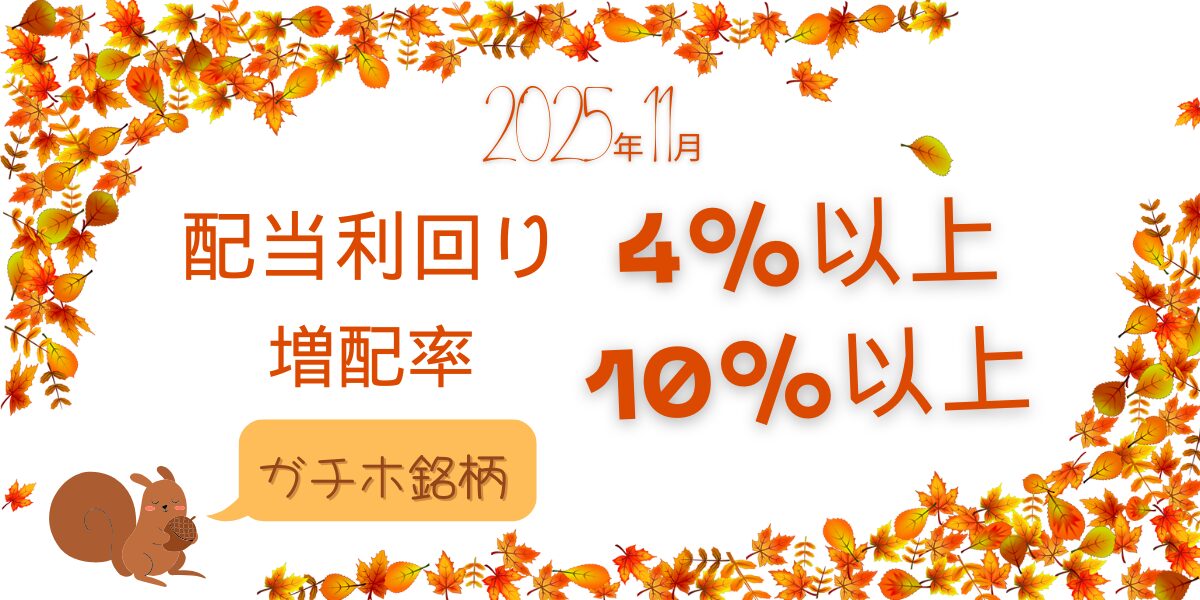 この記事では、私の保有銘柄のなかで2025年11月5日(水)の終値ベースで配当利回り4%以上、増配率10%以上の銘柄を厳選しました。